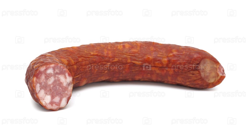 Кралька копченой колбасы на белом фоне