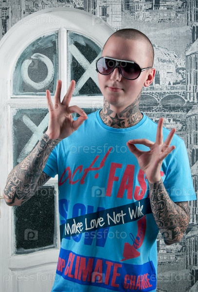 Лысый молодой мужчина с татуировками на теле показывает жест "ок"