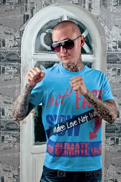 Лысый молодой мужчина с татуировками на теле в боксерской стойке
