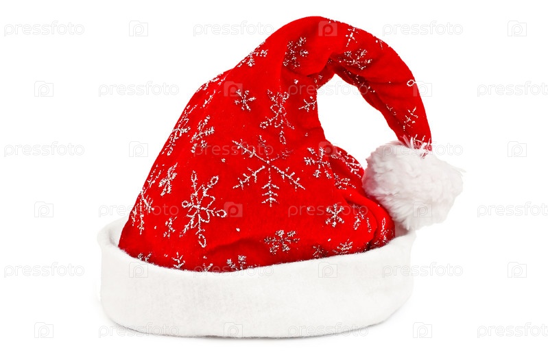 Красный колпак с узором из серебристых снежинок и белым меховым помпоном