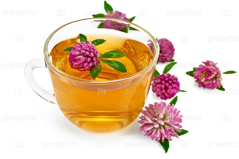 Травяной чай в стеклянной чашке и цветки клевера на белом фоне