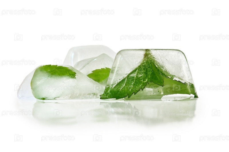 Лед с листьями мяты на белом фоне