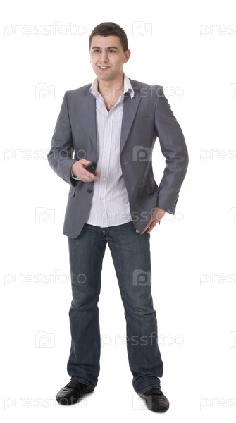 Молодой человек в джинсах и пиджаке с телефоном в руке, на белом фоне