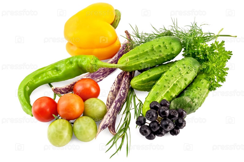 Помидоры, огурцы, перец, фасоль, зелень и черноплодная рябина на белом фоне