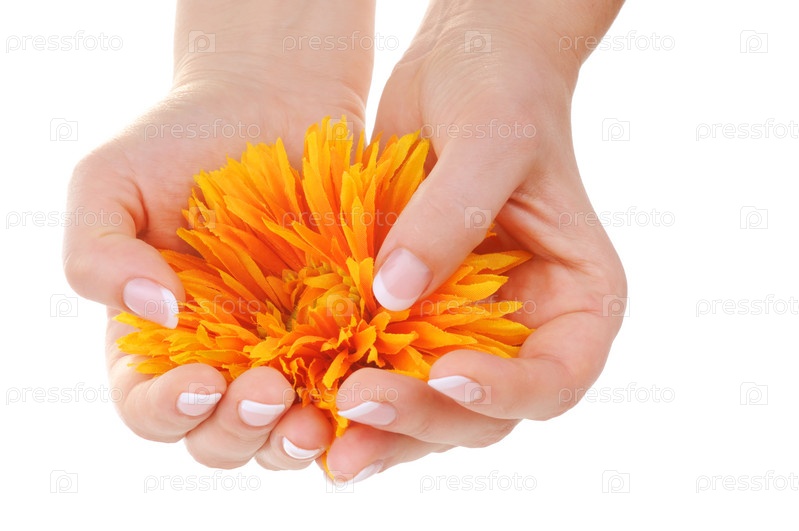 Женские руки с красивым французским маникюром и ярким оранжевым цветком