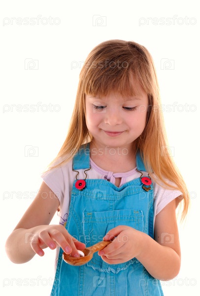 Маленькая девочка с одной большой белой таблеткой в деревянной ложке на белом фоне