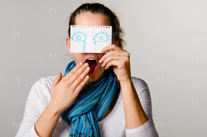 Женщина держит у лица бумагу с нарисованными плачущими глазами