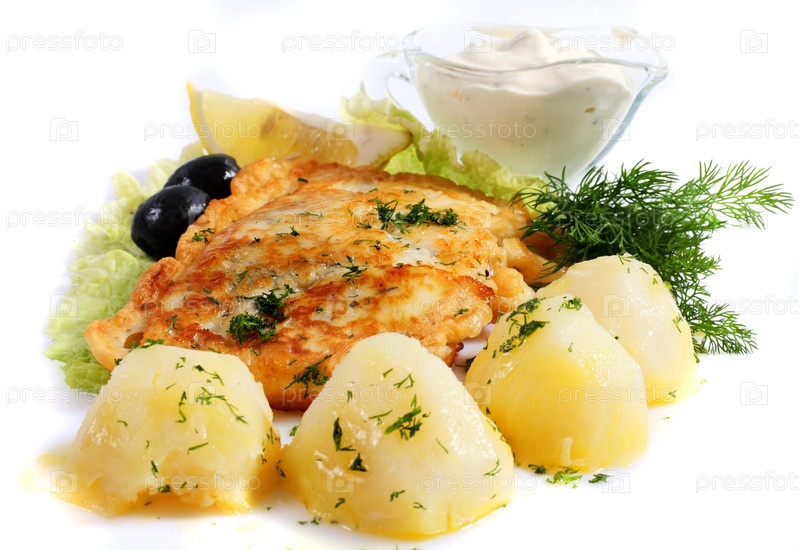 Кусок семги в кляре с овощами