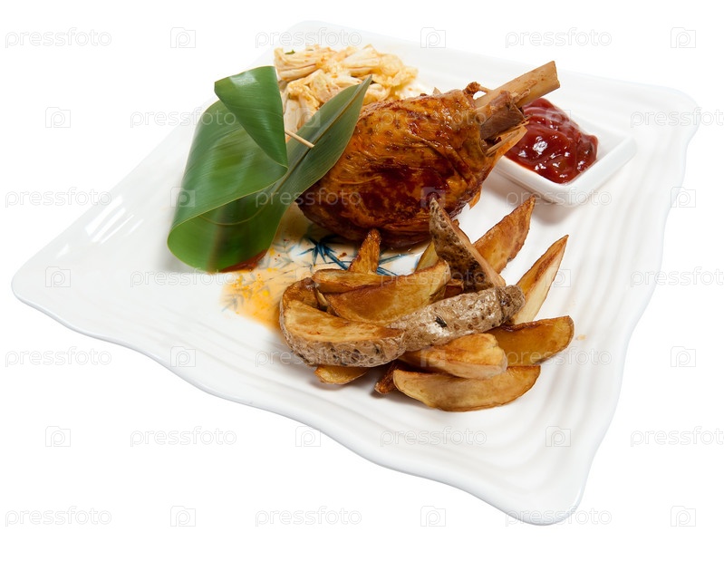 Жареная куриная ножка с картофелем и соусом
