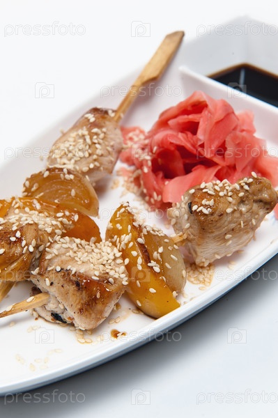 Шашлык на тарелке на белом фоне