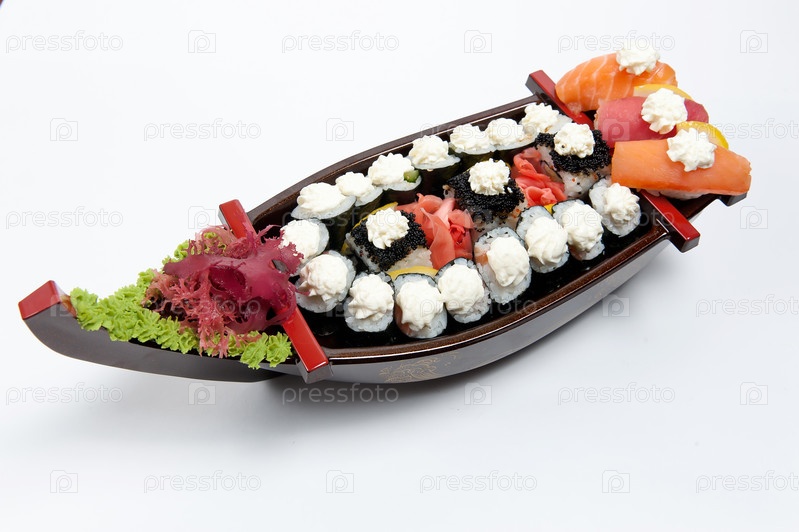 Суши на деревянной подставке в форме лодки на белом фоне