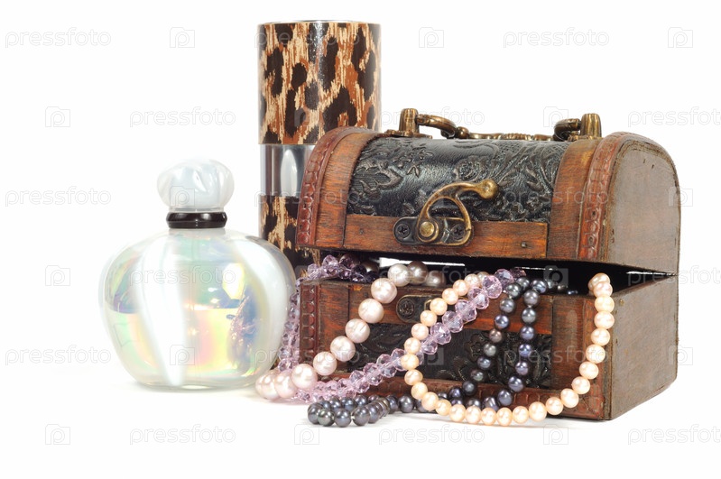 Деревянный сундучок с жемчугом и флакон духов