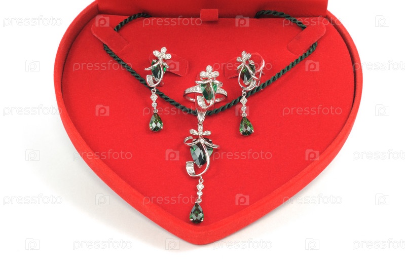 Платиновый комплект ювелирных изделий с изумрудами в красной коробке