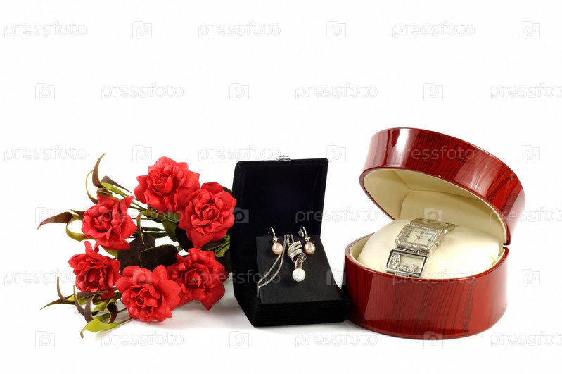 Ювелирные украшения в подарочной коробке с цветами и наручные часы в коробке