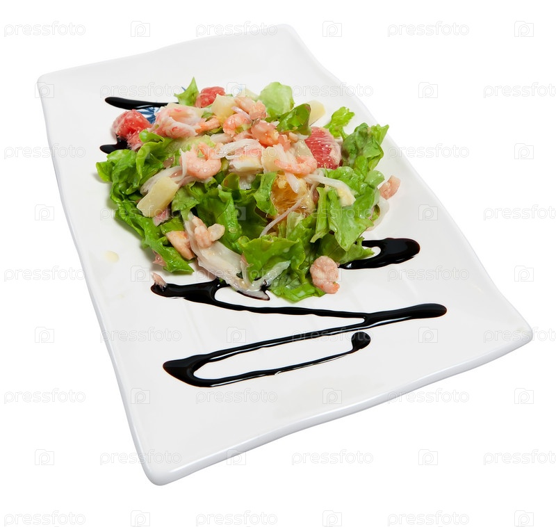 Салат с креветками и крабовым мясом на белом фоне