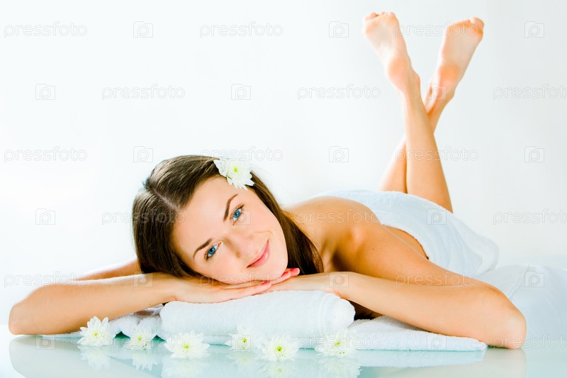 Портрет красивой девушки, лежащей на полотенце в комнате