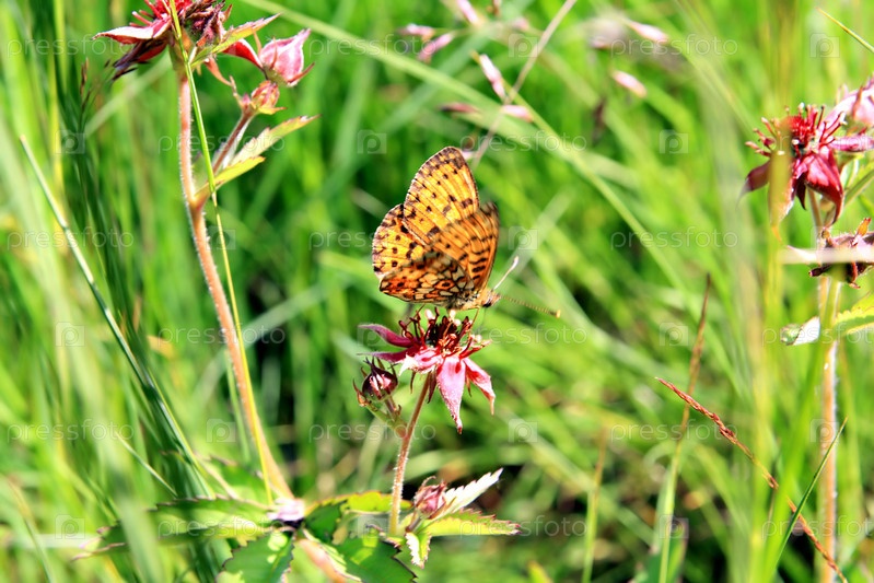 Коричневая бабочка на луговом цветке