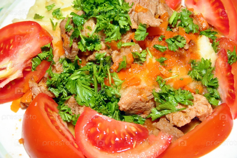 Мясо с картофельным пюре, помидорами и зеленью, крупным планом