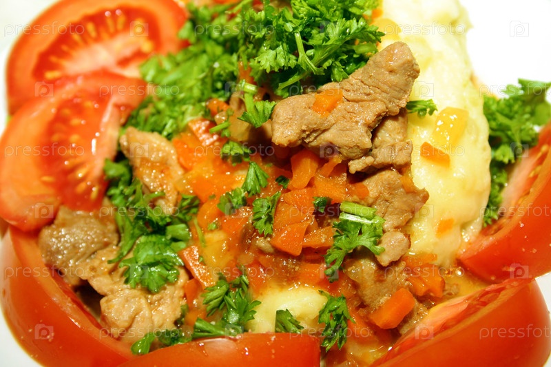 Мясо с картофельным пюре, помидорами и зеленью, крупным планом