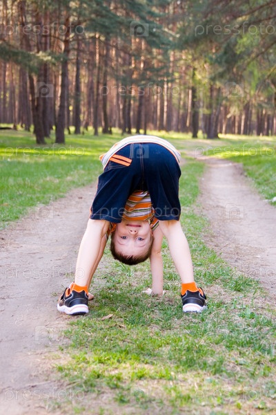 Мальчик стоит в смешном положении в сосновом лесу в летний день