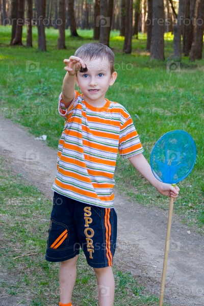 Мальчик ловит бабочку в сосновом лесу в летний день