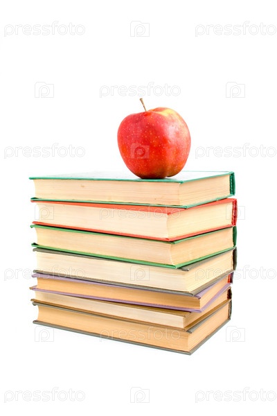 Красное яблоко и стопка книг на белом фоне