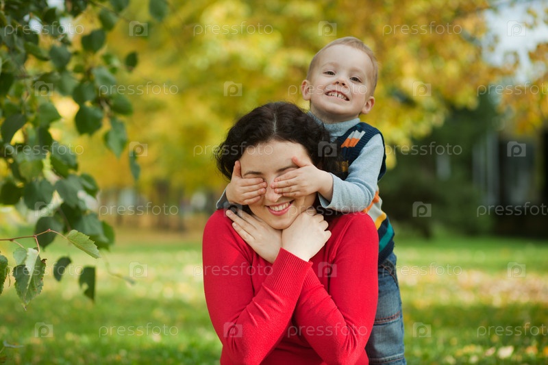 Сын и мать в парке осенью