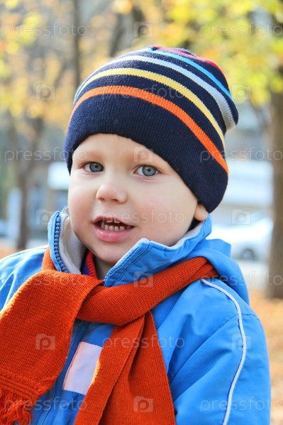 Довольный ребенок на осенней прогулке в парке