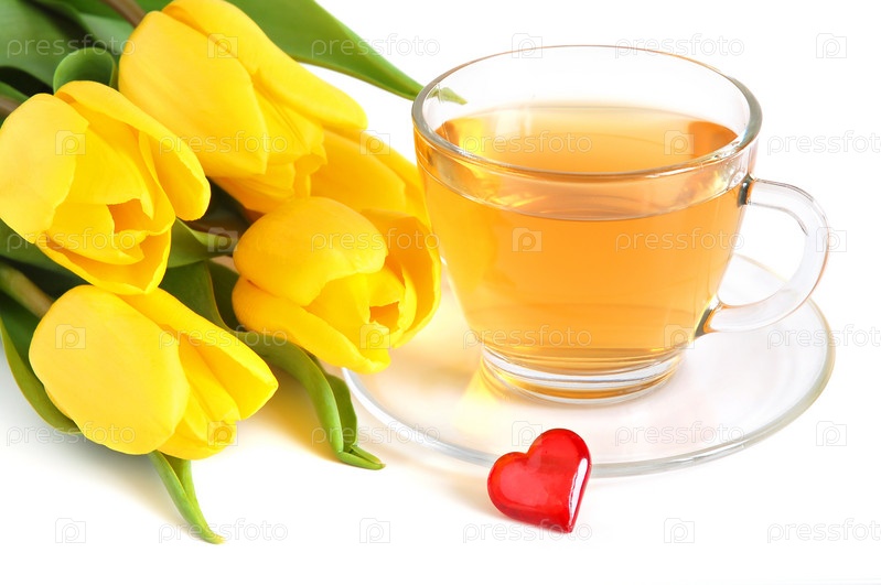 Чашка чая, тюльпаны и маленькое красное сердце на белом фоне