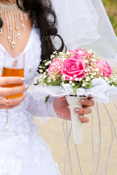 Красивый свадебный букет и бокал шампанского в руках невесты