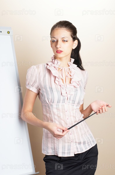 Молодая женщина стоит с указкой у доски, презентация проекта в офисе
