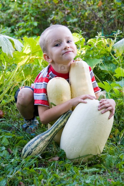Мальчик с урожаем кабачков в саду