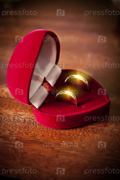 Два обручальных кольца в красном футляре на столе