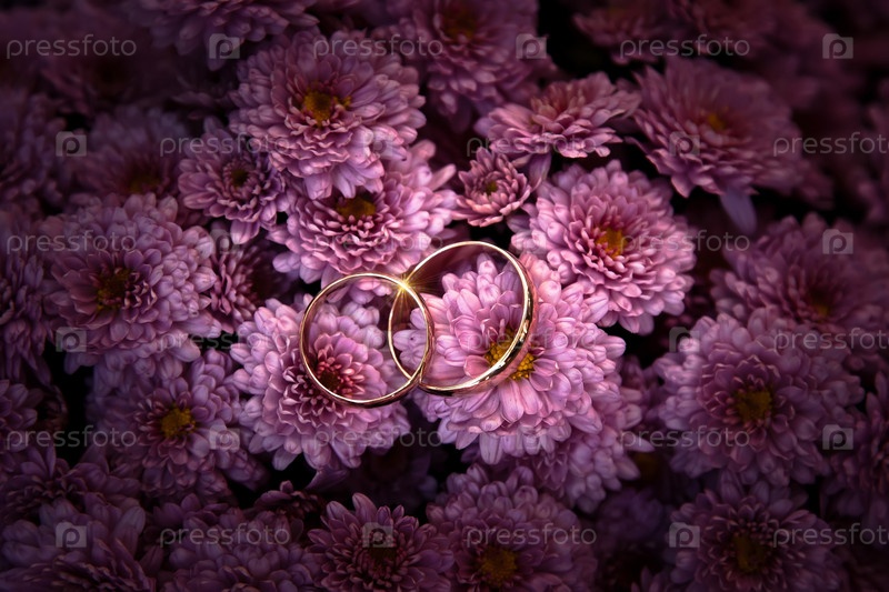 Два обручальных кольца лежат на розовых цветках хризантем