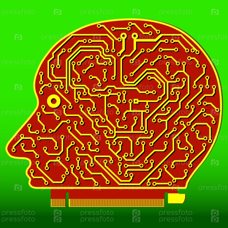 Компьютерная плата в форме человеческой головы, иллюстрация на зеленом фоне