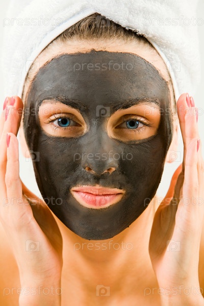 Близкий план женщины с полотенцем на голове и спа-маской на лице, держащей руки близко к лицу