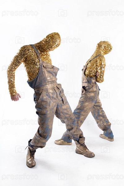 Два человека, покрытых золотыми блестками, в рабочих комбинезонах