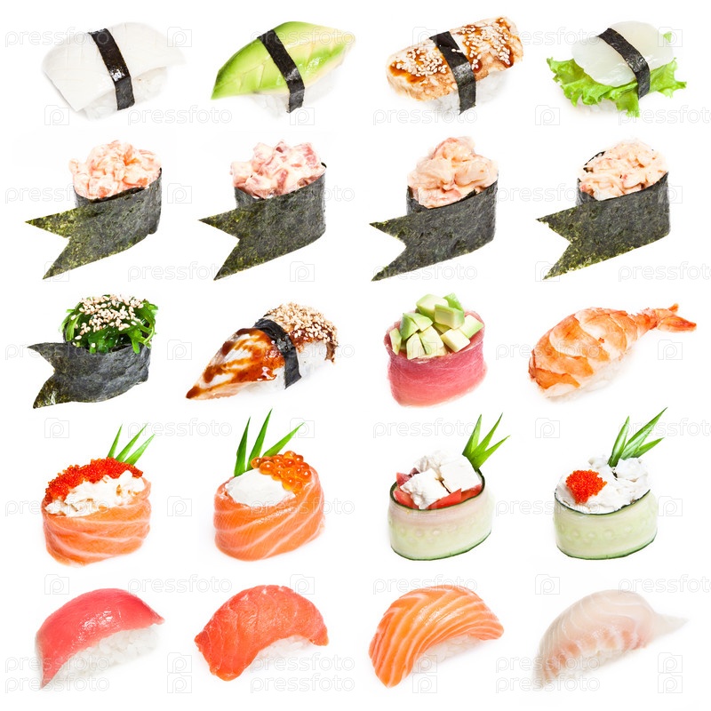 Различные виды суши на белом, коллаж