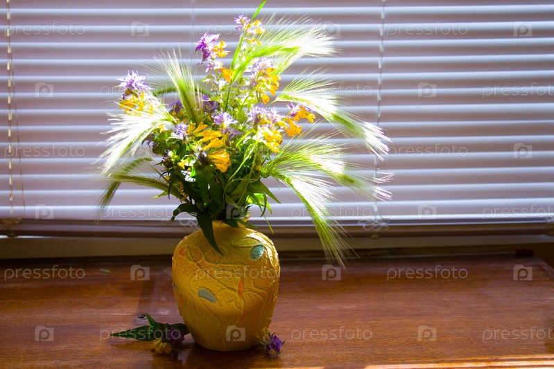 Красивый букет полевых цветов в вазе на фоне жалюзи