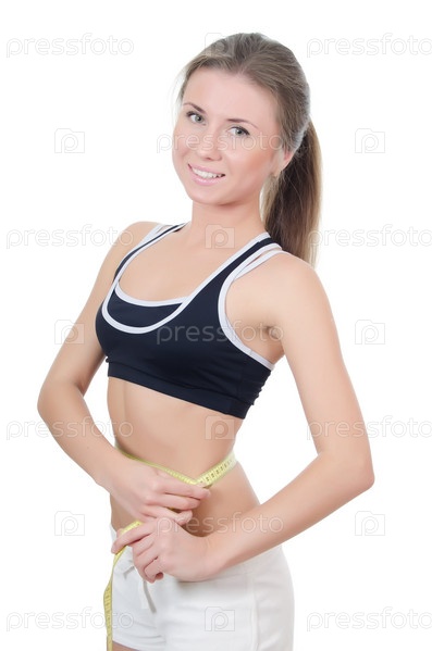 Стройная девушка измеряет свою талию