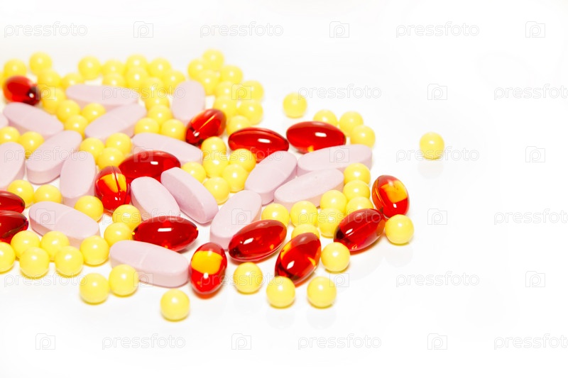 Разноцветные таблетки на белом фоне