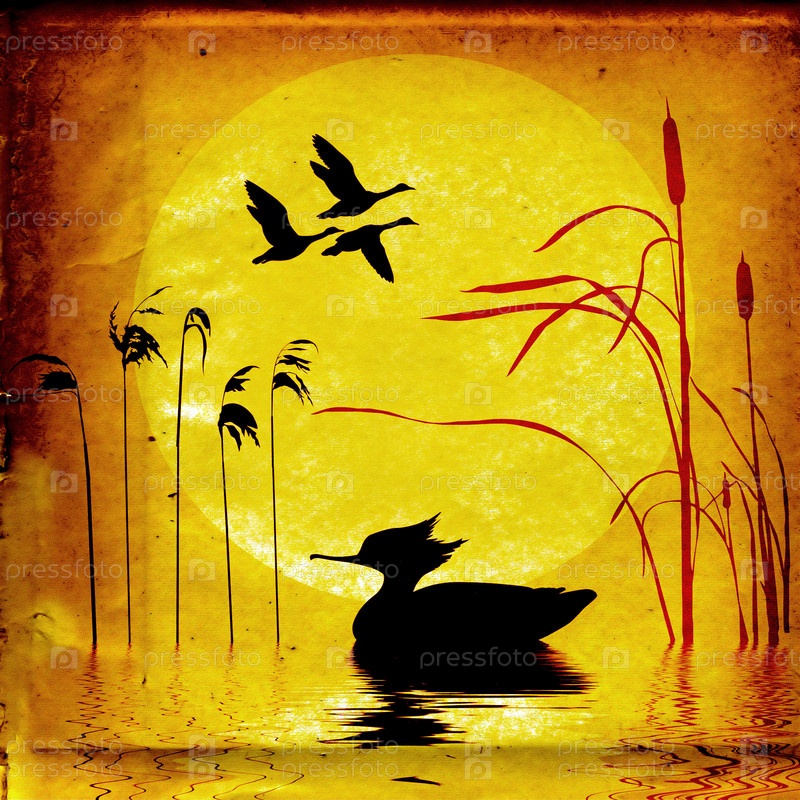 Болото и птицы на фоне восхода. Старый холст