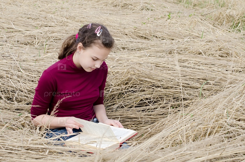 Девочка читает книгу в сухой траве