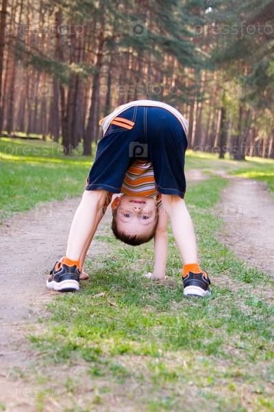 Мальчик стоит в забавной позе в сосновом лесу