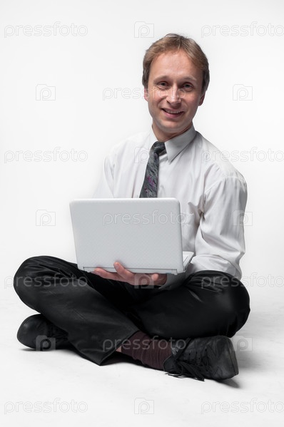 Портрет бизнесмена с ноутбуком на белом фоне