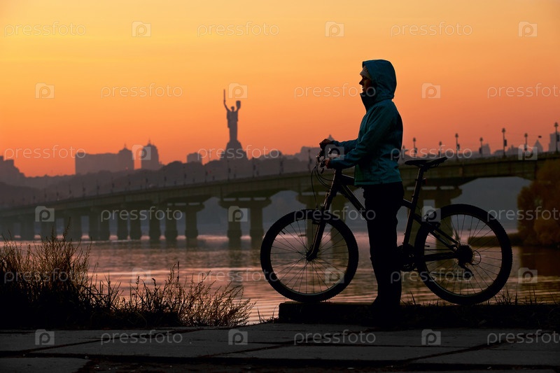 Молодая женщина с велосипедом на берегу реки на закате