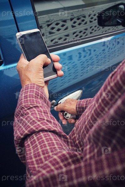 Человек открыть двери автомобиля с смарт-телефона