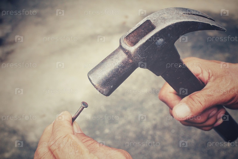 Человек с молотком и ногти на руке
