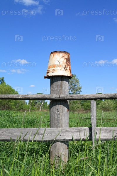 Старое ведро на деревянном заборе