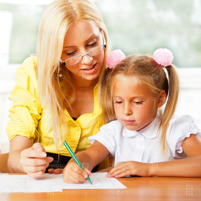 Учительница помогает школьнице выполнить задание